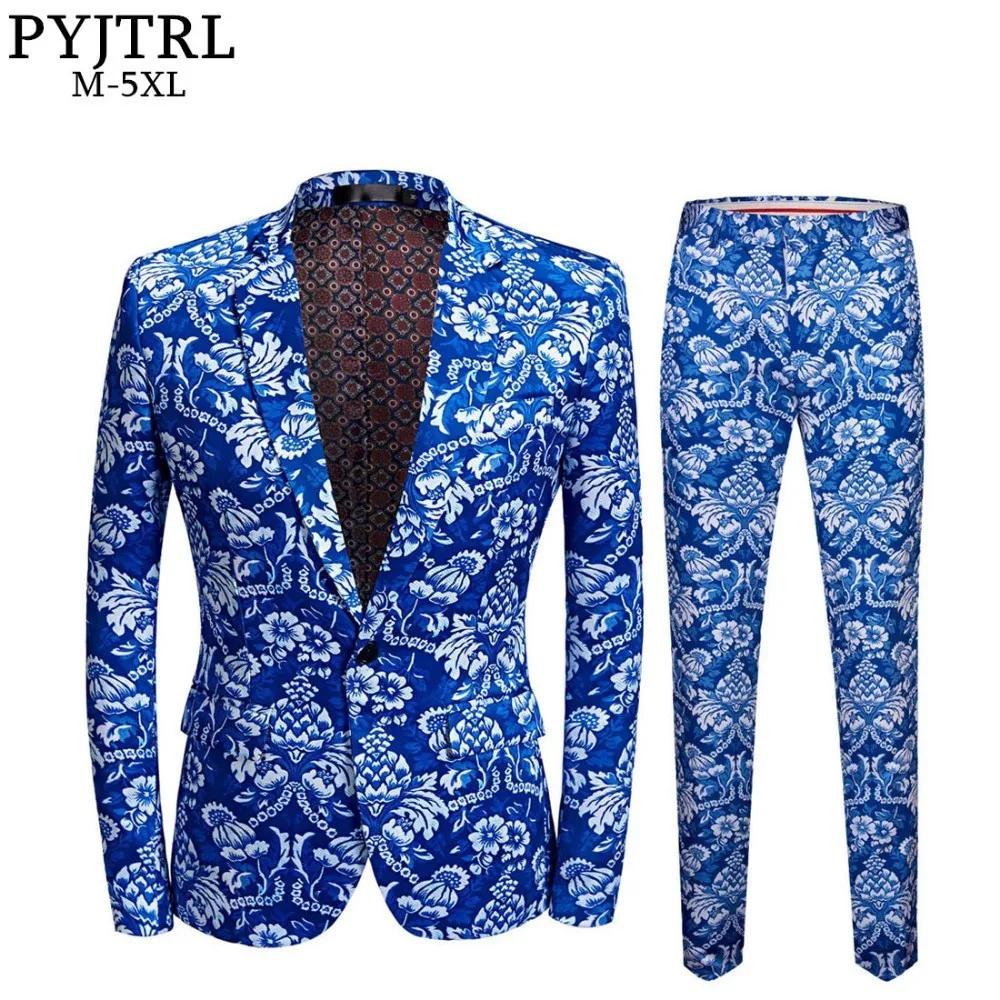 صور من PYJTRL العلامة التجارية جديد رجل خمر الأزرق الزهور طباعة سليم صالح الدعاوى مع السراويل زائد حجم 5XL فيستي أوم خطاباتخطابهزوجات العريس بدلة الزفا...