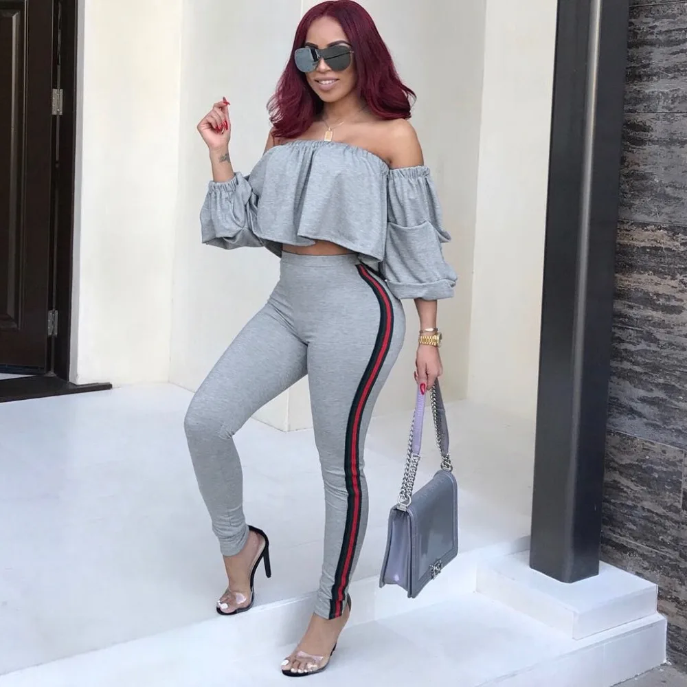 المنتجات ذات الصلة ل Suits و 2018 نساء الساخنة مثير قبالة الكتف الكشكشة مائل الرقبة نصف كم المحاصيل قمم مرونة الخصر كامل طول نحيل سروال