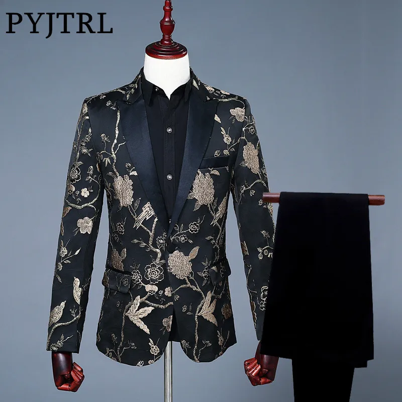 المنتجات ذات الصلة ل Suits و PYJTRL الفاخرة الجاكار التطريز الأزهار الطيور نمط الدعاوى للرجال الزفاف العرسان العريس بدلة ضئيلة صالح المغني زي